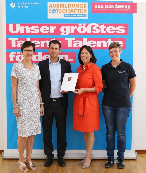 Der Hauptgeschäftsführer der Handwerkskammer der Pfalz, Dr. Till Mischler und Rita Petry, Geschäftsbereichsleiterin Berufsbildung, erhielten aus den Händen der Staatssekretärin des rheinland-pfälzischen Wirtschaftsministeriums, Daniela Schmitt, den Förderbescheid für das neue Projekt „Ausbildungsbotschafter“.