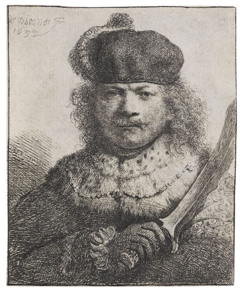 Bu: Bedeutendster Druckgraphiker seiner Epoche: Rembrandt van Rijn auf seinem „Selbstbildnis mit Säbel“, einer Radierung von 1634