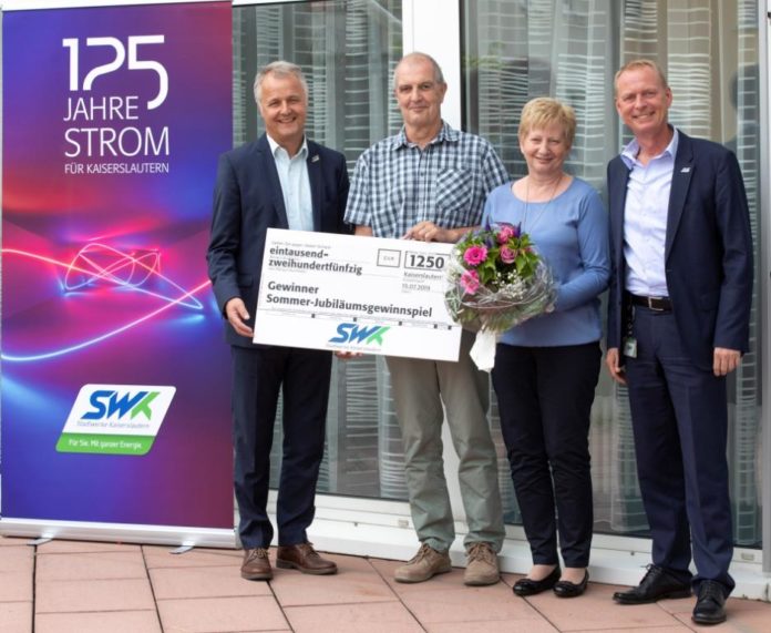 Anlässlich des Jubiläums, 125 Jahre Strom für Kaiserslautern, hat die SWK für ihre Kunden ein großes Gewinnspiel ausgelobt. Wer mit der SWK-App einmal im Quartal seinen Stromzählerstand übermittelt, nimmt automatisch an der Verlosung teil. Anita und Bernhard Günther aus Kaiserslautern sind die glücklichen Gewinner des zweiten Quartals und haben so 1.250 Euro gewonnen.