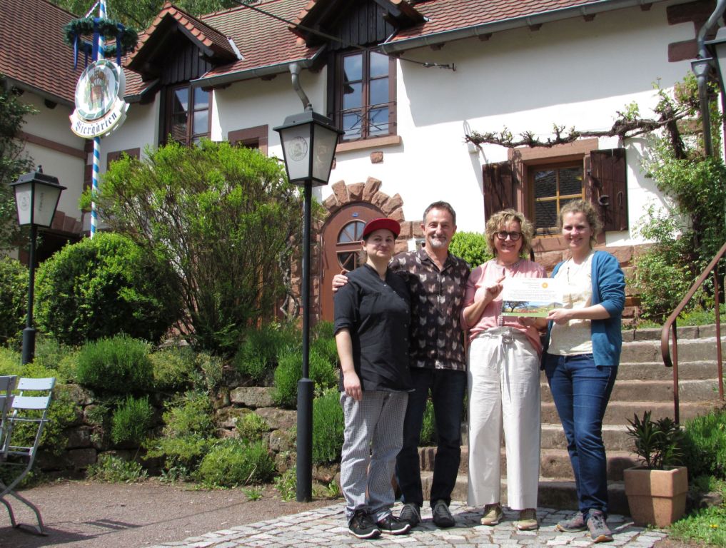 Melinda, Dieter und Marion Müller mit der Direktorin des Biosphärenreservats Pfälzerwald, Dr. Friedericke Weber (v.l.n.r.), die das Partnerschild überreicht hat (Foto: Biosphärenreservat/frei)