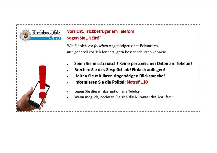 Sprechen Sie bitte mit Ihren Angehörigen, insbesondere mit älteren Menschen, über die Masche der Betrüger. Informieren Sie sie, wie sie sich besser vor Kriminellen schützen können. Sie helfen uns damit, den Betrügern das Handwerk zu legen. Informationen zur Kriminalprävention finden Sie auch unter www.polizei-beratung.de im Internet. |erf