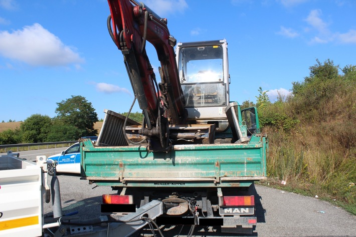 Beamten der Autobahnpolizei Kaiserslautern fiel am Montagmorgen auf der A63 bei Kaiserslautern ein auffällig beladener Lkw mit Anhänger auf. Bei der nachfolgenden Kontrolle stellten sie fest, dass der auf der Ladefläche des Lkw transportierte Bagger völlig unzureichend mit lediglich einem Spanngurt gesichert war. Dem 41 jährigen Fahrer wurde die Weiterfahrt untersagt. Gegen ihn und den Fahrzeughalter wurden Bußgeldverfahren auch mit dem Ziel der Vermögensabschöpfung eingeleitet.