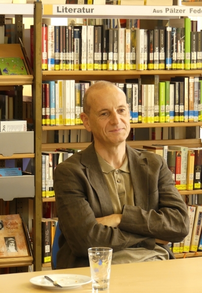 Bu: Literaturfrühstück geht in die zweite Runde: der Autor und Übersetzer Simon Werle, der unter anderem Baudelaires Gedichtband „Die Blumen des Bösen“ neu übertragen hat, war Ende Juni Gast in der Pfalzbibliothek