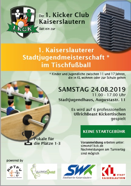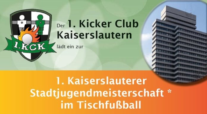 Der 1. Kicker Club Kaiserslautern lädt ein zur 1. Kaiserslauterer Stadtjugendmeisterschaft* im Tischfußball am 24.08.2019 ein.