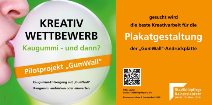 Im Rahmen ihrer diesjährigen Kampagne „Für ein sauberes KL“ hat die Stadtbildpflege Kaiserslautern (SK) einen Wettbewerb zum Thema Kaugummi-Entsorgung ausgeschrieben. Die Teilnahme lohnt sich gleich doppelt, denn neben einem Preis für das kreativste Plakat wird das Gewinnermotiv auch auf die Andrückplatten der GumWalls gedruckt und an drei Pilotstandorten aufgehängt. Gesucht werden Motive, die die Aufmerksamkeit auf die Kaugummifänger ziehen und die Vorbeigehenden motivieren, ihre ausgekauten Kaugummis auf die Andrückplatte zu kleben, anstatt sie auf die Straße zu werfen.