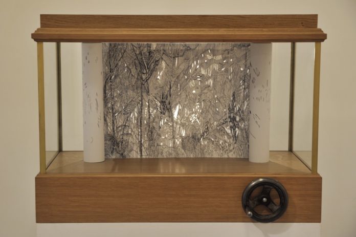 Neben großformatigen Wandreliefs, Skulpturen und Zeichnungen zeigt das mpk auch zwei Rollbilder, die Eva Jospin 2015 gefertigt hat. Bei diesen Rollbildern, die nach einem französischen Zeichner, Schriftsteller und Gartengestalter benannt sind, handelt es sich um Zeichnungen mit Bleistift und Tinte auf Transparentpapier, die in Glaskästen montiert sind. Mit Hilfe eines Drehmechanismus und Walzen lassen sich die Blätter wie in Zeitlupe horizontal vor den Augen bewegen. Historisch betrachtet, gehören sie zu den seit dem 17. Jahrhundert bekannten Guckkastenbildern. Vegetation, Bäume, Berge und Wasser werden bei den weitgehend abstrahierten Landschaftsbildern sicht- und spürbar. Kuratorin Annette Reich erläutert Eva Jospins faszinierende Naturwelt.
