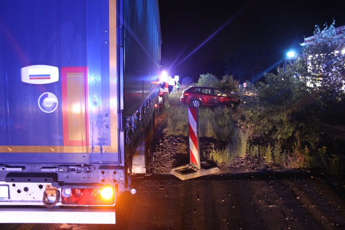 Der Unfall ereignete sich im Baustellenbereich der Autobahn A6 in Höhe der Anschlussstelle Kaiserslautern-West. Dort ist eine Geschwindigkeitsbeschränkung auf 60 km/h. Ein Sattelzug befuhr den Baustellenbereich mit ca. 60km/h auf dem rechten Fahrstreifen. Auf dem linken Fahrstreifen wurde er von einem Fahrzeug mit einem 19-jährigen Fahrer überholt. Zeugenangaben zufolge hatte er eine Geschwindigkeit von ca. 100 – 110 km/h. Er verlor die Kontrolle über sein Fahrzeug schleuderte gegen den Tank und die Fahrerkabine des Sattelzuges, drehte sich und rutschte unter die Schutzplanke. Es war enormes Glück dass niemand verletzt wurde. Der Sattelzug war nicht mehr fahrbereit und musste mit einem Spezialfahrzeug abgeschleppt werden. Ferner liefen ca. 500 Liter Diesel aus dem Tank. Dieses wurde durch die Feuerwehr Kaiserslautern und die Autobahnmeisterei gebunden und beseitigt. Die Autobahn war für ca. 3 Stunden gesperrt, wobei der Verkehr über die Parallelfahrbahn geleitet werden konnte. Der Gesamtschaden beläuft sich auf ca. 40000EUR. /Se.