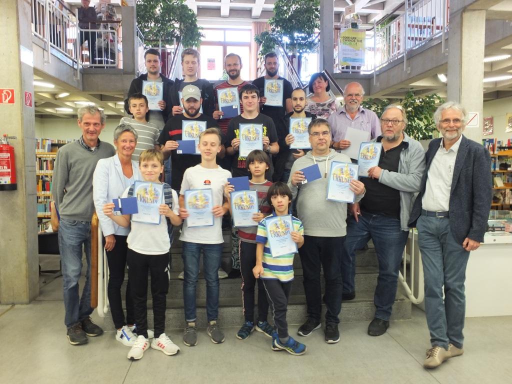 Insgesamt 34 Schachspieler sind am Samstag der Einladung der Stadtbibliothek gefolgt und haben an den 13. Bibliotheks-Open teilgenommen. Ab 11 Uhr morgens traten die 34 Teilnehmer in neun Runden nach Schweizer System gegeneinander an. Insgesamt 14 Preise wurden vergeben, Turniergesamtsieger wurde Oleg Yakovenko, gefolgt von Ansgar Barthel und Matthias Huschens auf den Plätzen zwei und drei.