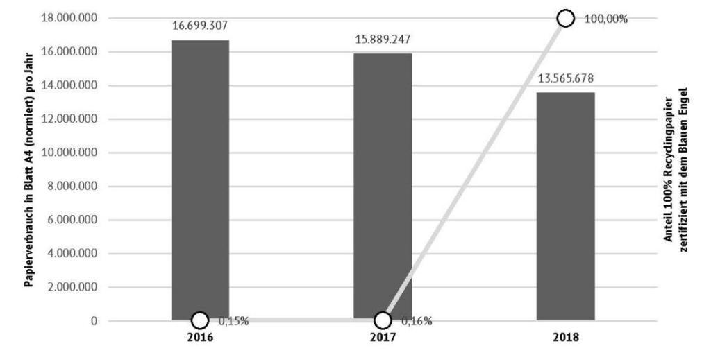 Seit vergangenem Jahr findet auf dem Kaiserslauterer Campus nur noch Recyclingpapier mit der Zertifizierung „Blauen Engel“ Verwendung. Bei der Umstellung von Normal- auf Recyclingpapier war das Nachhaltigkeitsbüro der TUK maßgeblich verantwortlich. Es wurde hierbei von Freiwilligen der Hochschulgruppe FUTURE Nachhaltigkeit unterstützt. Dabei arbeiteten sie eng mit der Hochschulleitung und den zuständigen Abteilungen der Universität zusammen.