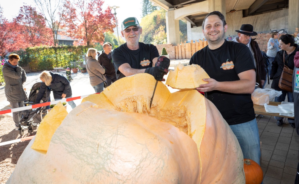 Traditionell werden die drei Siegerkürbisse der Rheinland-Pfälzischen Kürbiswiegemeisterschaft geschlachtet und an die Besucher verteilt. Der Umwelt zuliebe verzichtet die Gartenschau in diesem Jahr auf Plastiktüten. Das heißt: Alle die sich ein Stück mitnehmen möchten dürfen ein passendes Behältnis nicht vergessen.