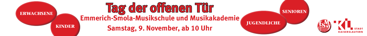 Dieses Jahr ist der Tag der offenen Tür der Emmerich-Smola-Musikschule und Musikakademie der Stadt Kaiserslautern am Samstag, 09. November, in einem ganz besonderen Format zu erleben: zum ersten Mal werden sich auch Kurse aus dem Konzept PLAYGROUND präsentieren. Hier trifft Musik auf Kunst, Tanz oder digitale Technik. Außerdem für alle Kids: Instrumente zum selbst bauen.