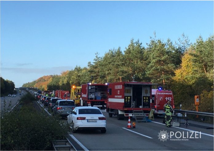 Nach dem Lkw-Unfall auf der A6 am frühen Dienstagmorgen (wir berichteten: https://www.nachrichten-kl.de/2019/11/05/lkw-unfall-a6-teilweise-gesperrt/) ist die Autobahn in Fahrtrichtung Saarbrücken zwischen Enkenbach-Alsenborn und KL-Centrum immer noch gesperrt (Stand 16 Uhr). Der umgekippte Lkw konnte zwar inzwischen geborgen, aufgerichtet und verladen werden, aktuell laufen aber noch die Reinigungsarbeiten auf der verschmutzten Fahrbahn. Diese dauern voraussichtlich noch bis etwa 16.30 Uhr.