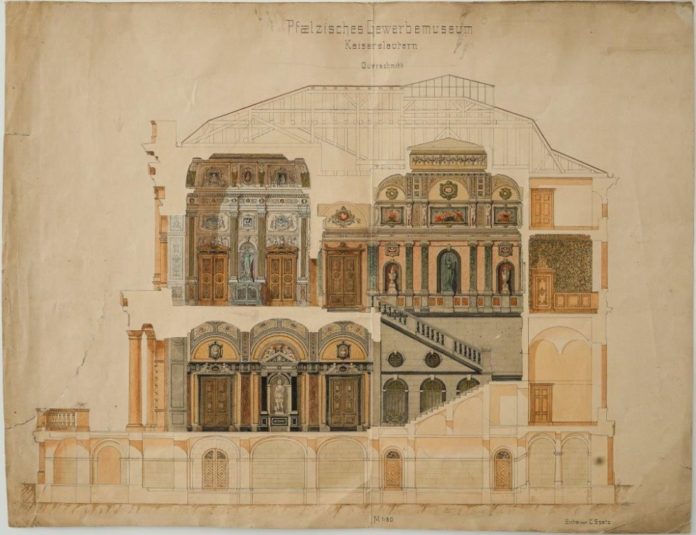 Bu: Pfälzisches Gewerbemuseum Kaiserslautern im Querschnitt (Maßstab 1:50): aquarellierte Zeichnung (1874) von dem Architekten Karl Spatz