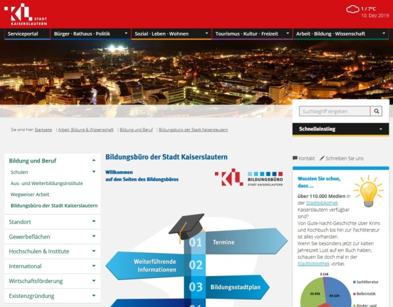 Das Bildungsbüro der Stadt Kaiserslautern hat es sich zur Aufgabe gemacht, die vielfältigen Angebote der städtischen Bildungslandschaft transparent aufzuzeigen. Ein Baustein hierfür sind die Seiten des Bildungsbüros, die ab sofort auf der Homepage der Stadt zu finden sind (https://www.kaiserslautern.de/arbeit_bildung_wissenschaft/bildung/bildungsbuero/index.html.de ). Die Seiten sind unter anderem mit einem Kalender der aktuellen Veranstaltungen rund um das Thema Bildung, weiterführenden Informationen und einem Bildungsstadtplan bestückt. „Wir freuen uns über alle Anregungen und Hinweise, die wir erhalten, damit die Seiten des Bildungsbüros für die Bürgerinnen und Bürger kontinuierlich weiterentwickelt und noch bedarfsgerechter zugeschnitten werden können,“ so Bildungsmanagerin Sabine Michels.