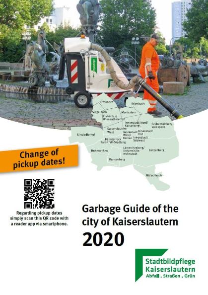 Auch für das kommende Jahr gibt die Stadtbildpflege Kaiserslautern wieder eine Neuauflage des „Garbage Guide of the city of Kaiserslautern“ heraus. Im Abfallratgeber für das Stadtgebiet erhalten englischsprachige Mitbürgerinnen und Mitbürger auf insgesamt 32 Seiten wichtige Informationen zu den Themen Vermeidung, Wiederverwendung, Verwertung und Beseitigung von Abfällen. In der praktischen DIN A 5-Broschüre sind beispielsweise die Anschriften und Öffnungszeiten der städtischen Wertstoffhöfe, die Standorte und Termine der mobilen Schadstoffsammlung (Umweltmobil) und Details rund um die kommende Weihnachtsbaumsammlung angegeben. Daneben bietet die Broschüre eine Übersicht zur richtigen Abfalltrennung.