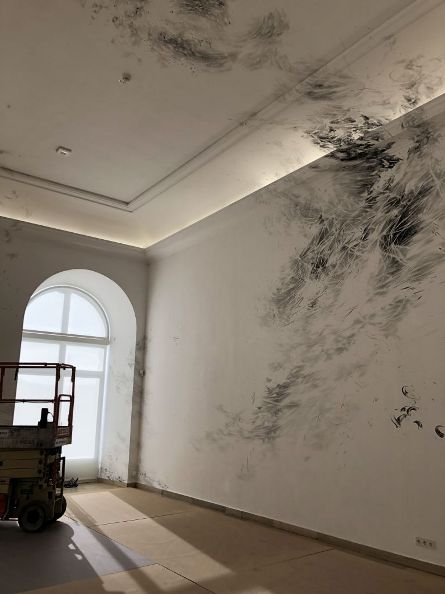 Bu: Anfang für eine monumental angelegte Wandzeichnung: erste Pinselzeichnungen im Foyer des mpk