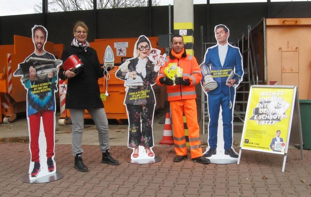 Foto (Copyright Stadtbildpflege KL): Werben zusammen für die richtige Entsorgung des E-Schrotts: Andrea Buchloh-Adler und Giuseppe Falco mit den Kampagne-Trägern Erik, Frauke und Gero (v. l.).