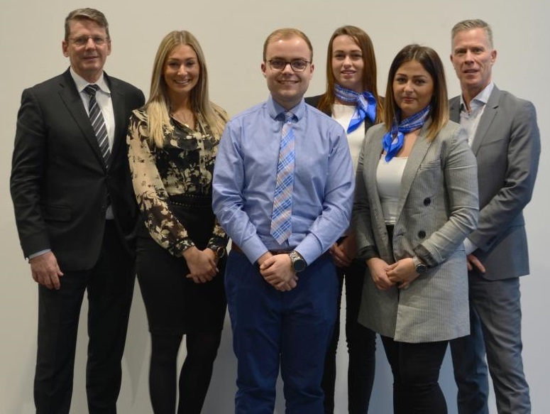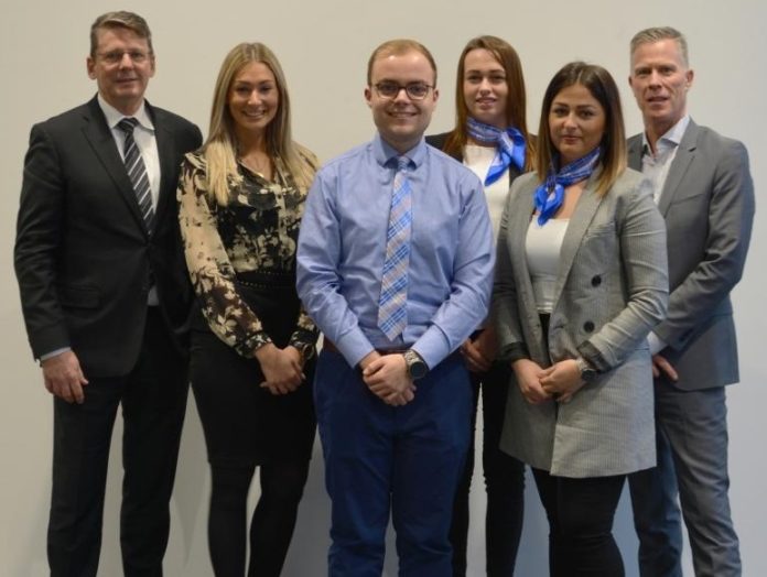 Bildtext: v.l.n.r. – Albrecht Steller (Vorstand), Leandra Lintgen (Personalmanagement), Nico Ambis, Kathrin Heinz, Anita Müller, Alexander Kostal (Vorstand).