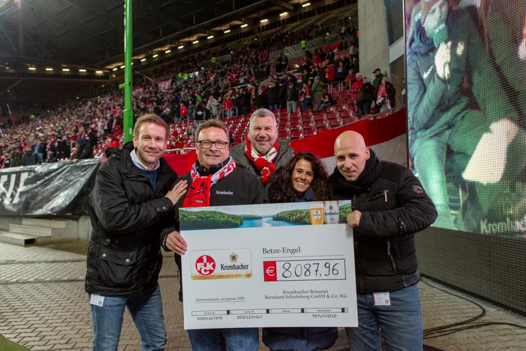 „Die Aktion war ein voller Erfolg und die Resonanz der Fans großartig: Dank ihrer Unterstützung konnte die Spendensumme aus dem Vorjahr sogar noch einmal getoppt werden“, freut sich Hans Zimmer, Gebietsverkaufsleiter der Krombacher Brauerei. Er überreichte beim Heimspiel gegen die SG Sonnenhof Großaspach am vergangenen Montag den symbolischen Spendenscheck an Horst Schömbs, Botschafter der „Betze-Engel“ und an einige Vorstandsmitglieder des Vereins (Dagmar Eckel, Gero Scira, Tobias Frey). „Wir sind besonders stolz über das erneute und absolut nicht selbstverständliche Engagement unseres Partners Krombacher. Gemeinsam mit unseren tollen Fans wurde so ein erneuter und großartiger Beitrag für die Betze-Engel geleistet. Wir können uns einfach nur bedanken, bei Krombacher und unseren einmaligen Fans“, so der stellvertretende Vorstandsvorsitzende Tobias Frey.
