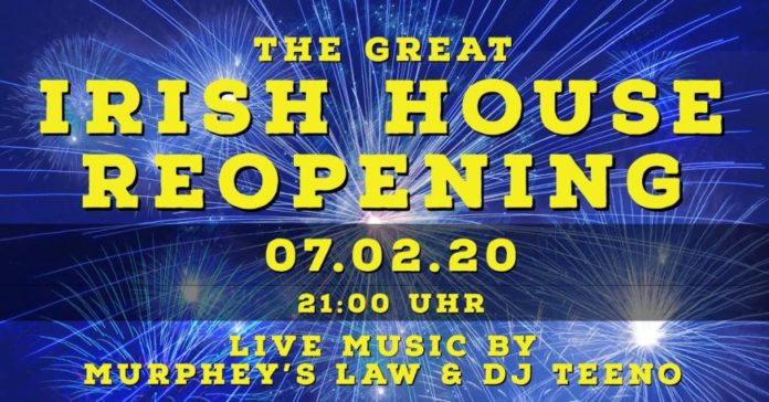 Nun ist es offiziell – im Irish House weht frischer Wind! Unser Team möchte das gebührend mit euch feiern – deshalb laden wir euch am 07.02.20 zur großen Reopening Party ein! Für Live-Musik und ausgelassene Stimmung werden an diesem Abend Murphey´s Law sorgen, bevor DJ Teeno euch mit den größten Hits der 80er und 90er zum Tanzen bringt!