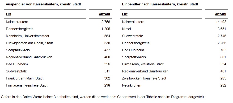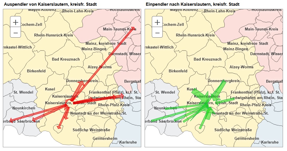 In der Region „Kaiserslautern, kreisfr. Stadt“ wohnen 36.168 sozialversicherungspflichtig Beschäftigte. Von ihnen pendeln 13.708 oder 37,9% zur Arbeit in einen anderen Kreis (Auspendler). Gleichzeitig pendeln 31.173 Beschäftigte, die in einem anderen Kreis wohnen, zur sozialversicherungspflichtigen Beschäftigung in die Region „Kaiserslautern, kreisfr. Stadt“ (Einpendler). Der Saldo von Aus- und Einpendlern beläuft sich auf +17.465 (Pendlersaldo). Ihren Arbeitsort in der Region „Kaiserslautern, kreisfr. Stadt“ haben damit 53.633 sozialversicherungspflichtig Beschäftigte, von ihnen sind 58,1% Einpendler.