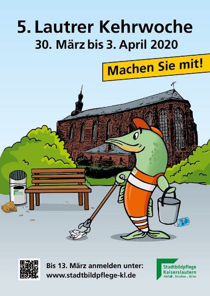 Vom 30. März bis 3. April 2020 ist es wieder soweit: Kurz vor den Osterferien lädt die Stadtbildpflege Kaiserslautern (SK) zur nächsten „Lautrer Kehrwoche“ ein. Erwachsene, Jugendliche und Kinder können sich dann erneut für eine saubere Umwelt einsetzen und Schulwege, Grünanlagen, Spielplätze, Parks und Gehwege von achtlos weggeworfenem Müll befreien.