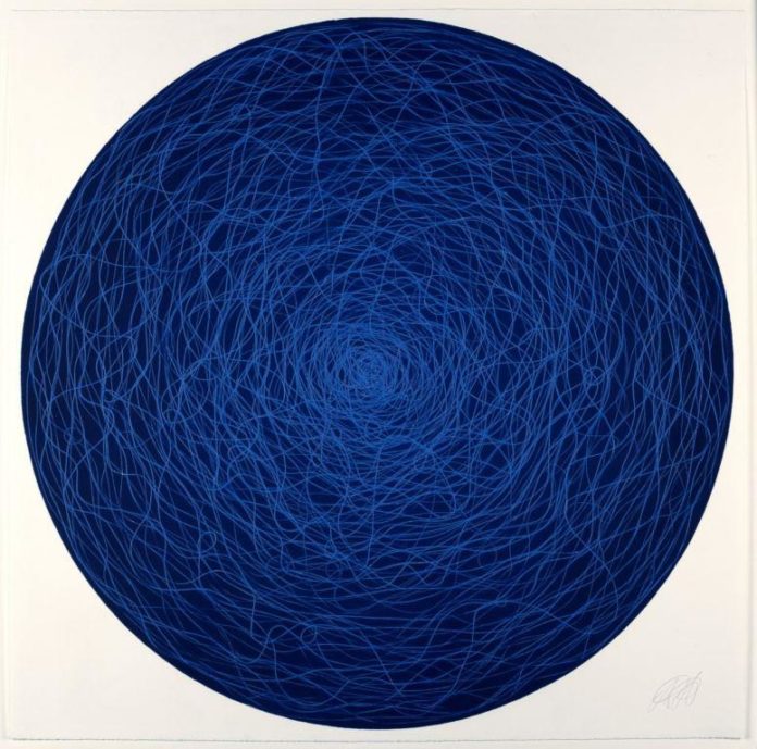 Bu. Endlos verschlungene Linien: Alexander Arundells Materialdruck „Super massive wild circle, blue“ von 2018