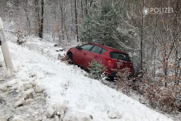 Die Autofahrerin war kurz nach 7 Uhr mit ihrem Toyota von Leimen kommend in Richtung Johanniskreuz unterwegs. In einer Linkskurve geriet sie auf der mit Schneematsch bedeckten Straße nach rechts von der Fahrbahn ab. Der Pkw rutsche die Böschung hinunter und beschädigte dabei ein Verkehrsschild. Etwa 4 Meter unterhalb der Bundesstraße kam das Fahrzeug schließlich zum Stehen.