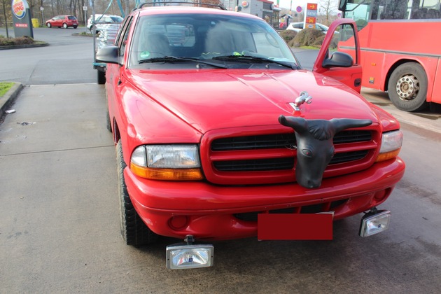 Die Beamten der Autobahnpolizei Kaiserslautern staunte nicht schlecht, als sie am Mittwochmorgen einen Pickupfahrer kontrollierten. Kurz vor der Anschlussstelle Ramstein-Miesenbach wurden sie auf ein Fahrzeug aufmerksam, welches neben einem serienmäßig auf der Motorhaube befindlichen Widderkopf noch zusätzlich einen großen Stierkopf aus Plastik an der Fahrzeugfront befestigt hatte. Das Befestigen eines solchen Teiles ist natürlich unzulässig, wie auch weitere an dem Pickup festgestellte Beleuchtungselemente, die ursprünglich für die Möbelindustrie gedacht waren. Er gab gegenüber den Beamten an, dass er das Fahrzeug nach einer Teilnahme an einem Karnevalsumzug noch nicht komplett umgerüstet habe. Die im Innenraum verteilten Konfetti ließen keine Zweifel an seinen Angaben aufkommen. Den 59-jährigen Fahrer wurde die Weiterfahrt mit seinem Fahrzeug in dieser Form untersagt und ein Bußgeldverfahren wegen Erlöschen der Betriebserlaubnis eingeleitet.|past