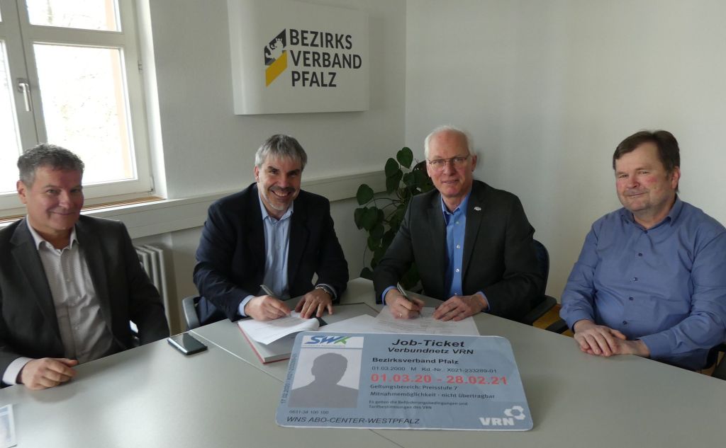 Bu: Wesentlich günstiger mit der Bahn zum Arbeitsplatz gelangen (von links): Vertragsunterzeichnung mit Klemens Strey und Boris Flesch von der SWK und Matthias Johann und Frank Hasselbeck vom Bezirksverband Pfalz; nicht im Bild: Larissa Wöller vom Westpfälzischen Nahverkehrs-Service Kaiserslautern, die sich um die Abwicklung gekümmert hat.
