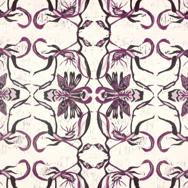 Bu: Nicole Bellaires Farbholzschnitt auf Papier in neun Teilen: Einzelblatt der „Schmetterlingsblume im Rapport“ von 2017