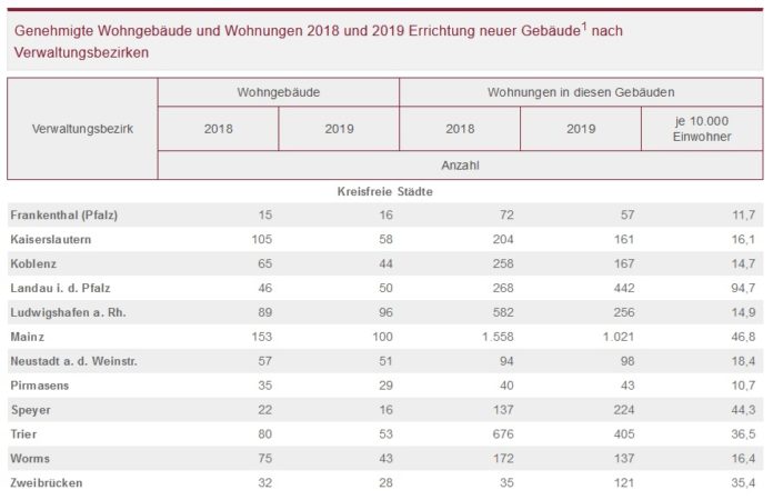 Im Jahr 2019 wurden in Rheinland-Pfalz weniger Baugenehmigungen zur Errichtung von Neubauwohnungen erteilt als im Jahr 2018. Nach Angaben des Statistischen Landesamtes in Bad Ems bewilligten die Bauaufsichtsbehörden den Bau von 13.423 Wohnungen. Das waren 4,7 Prozent weniger als im Jahr zuvor. Die Anzahl der genehmigten neuen Wohngebäude lag hingegen mit 6.177 um 0,9 Prozent leicht höher als im Jahr 2018.