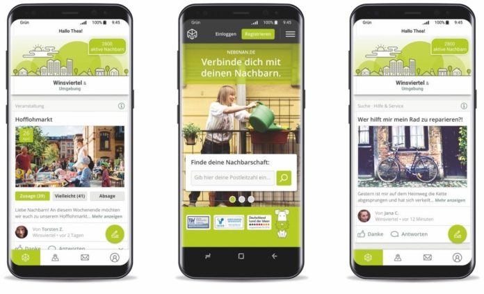 Ältere sind besonders gefährdet, nach einer Infektion mit dem Coronavirus schwer zu erkranken. Ebenso ergibt sich in der Nachbarschaft durch die Schulschließungen ein Bedarf zur gegenseitigen Kinderbetreuung – ohne dass wiederum Ältere in Kontakt kommen sollten. Das Nachbarschaftsnetzwerk nebenan.de ist in den vergangenen Jahren zu einem bundesweiten Netzwerk im Örtlichen gereift. Teilnehmende werden dabei mittels Postkarte weitgehend zuverlässig authentifiziert. Die entstehenden Gruppen sind anschließend auf den jeweiligen Ort begrenzt. Angebote und Nachfrage umfassen unter anderem Nachbarschaftshilfe wie „Einkaufen für ältere Leute“ und „Einkaufen gehen. (Illustration: nebenan.de)