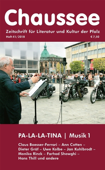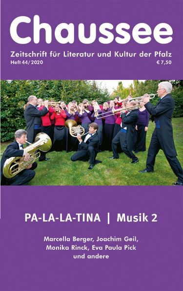 Die Vorstellung der neuen Ausgabe der „Chaussee“ in Bad Dürkheim am 31. März ist – wie alle anderen Veranstaltungen des Bezirksverbands Pfalz – abgesagt. Heft 44, das sich dem Thema „Musik“ widmet, wird zu einem späteren Zeitpunkt der Öffentlichkeit präsentiert. Interessierte können es zum Preis von 7,50 Euro über den Online-Buchshop des Bezirksverbands Pfalz (www.bv-pfalz.de/shop/) bestellen; das 152-seitige Heft wird – wie alle vorherigen Ausgaben auch – frei Haus geliefert. Heft 43 beschäftigt sich mit dem Thema „Text / Bild“, Heft 42 mit „Heimat“ und Heft 41 ebenfalls mit der „Musik“. Da die Redaktion 2018 derart viele Beiträge dazu bekommen hatte, entschloss sie sich, eine zweite, musikalische Ausgabe herauszubringen.