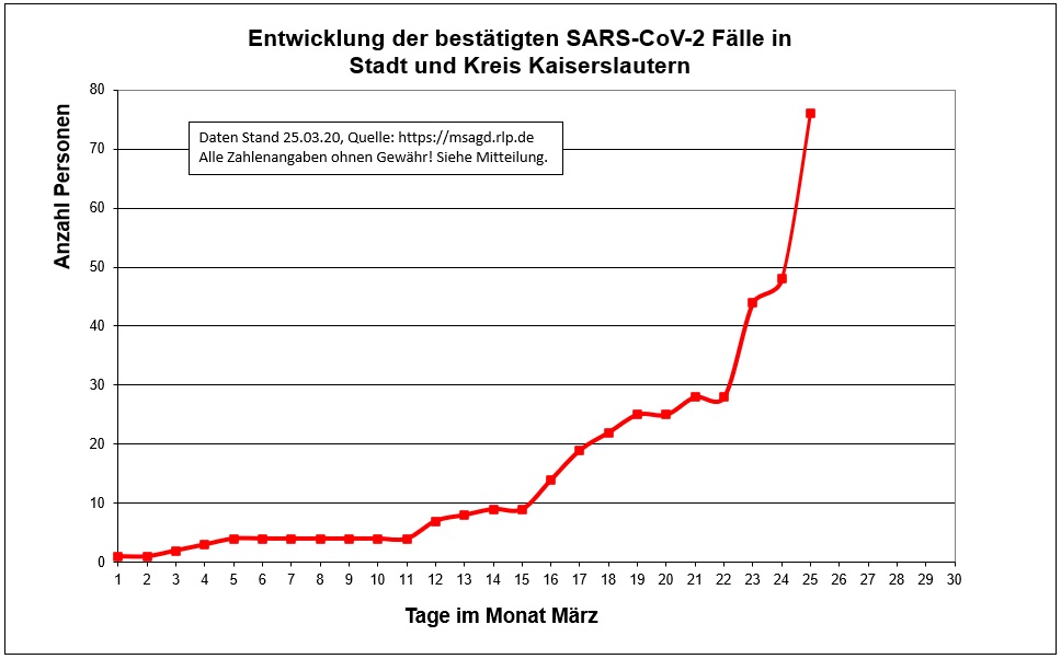 Die im Diagramm genannten Zahlen entsprechen den in der Meldesoftware des Robert Koch-Instituts übermittelten laborbestätigten Fällen einer COVID-19 Erkrankung mit Meldeadresse in Stadt und Kreis Kaiserslautern. Diese werden von den Gesundheitsämtern über die Landesmeldestelle beim Landesuntersuchungsamt an das Robert Koch-Institut übermittelt. Da die Mitarbeiterinnen und Mitarbeiter der Gesundheitsämter vor Ort am Wochenende in erster Linie mit der Ermittlung von Kontaktpersonen und Quarantänemaßnahmen gebunden sind, erfolgen die Meldungen zum Teil zeitverzögert.