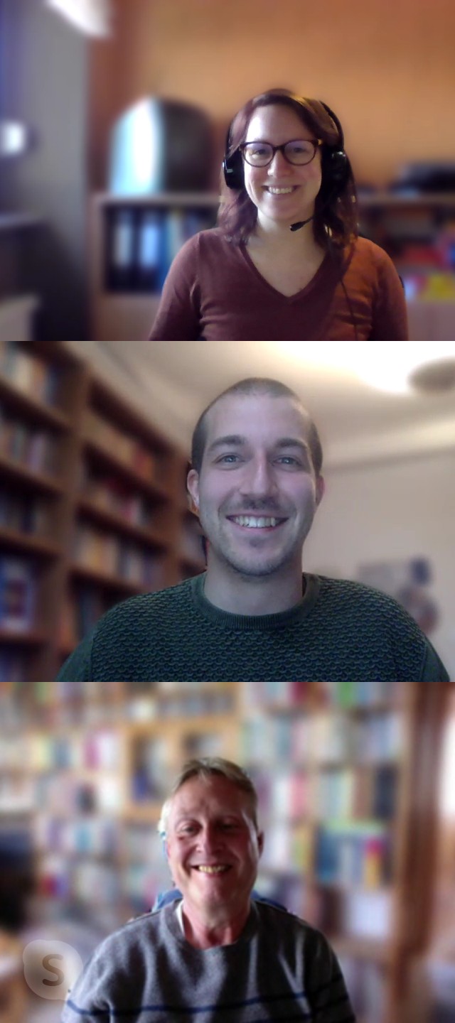 Screenshot der letzten Videokonferenz, in der Mitte ist Doktorand Davide Manfredo zu sehen, unten im Bild sein Betreuer Dr.-Ing. Joachim Linn und oben Vanessa Dörlich. Sie unterstützt ebenfalls im Rahmen von THREAD.
