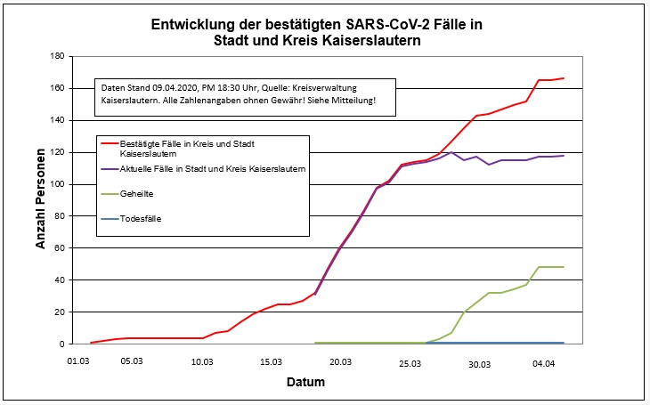 Insgesamt gelten mittlerweile 48 ehemals positiv-getestete Personen als geheilt. (12 VG Enkenbach-Alsenborn, 3 VG Landstuhl, 6 VG Otterbach/Otterberg, 5 VG Weilerbach, 3 VG Ramstein-Miesenbach, 19 Stadt KL)