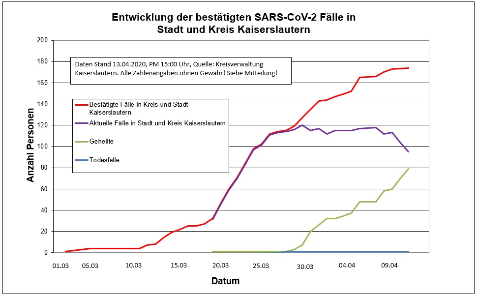 Somit wurden bislang insgesamt 174 Personen im Zuständigkeitsbereich des Gesundheitsamtes der Kreisverwaltung Kaiserslautern positiv auf das Coronavirus getestet.