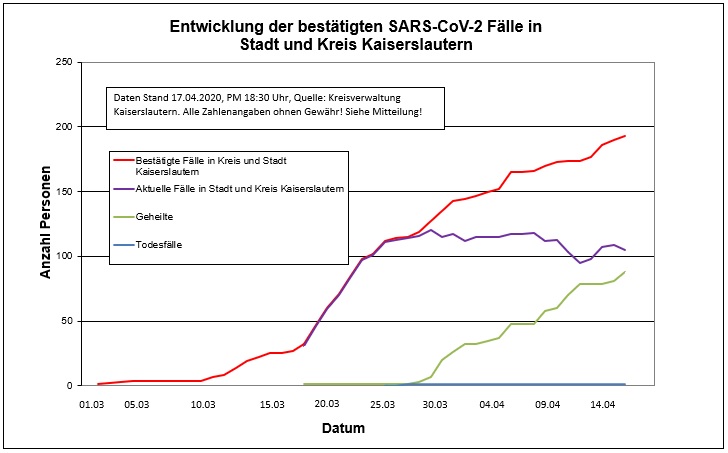 Heute wurden 3 weitere positive Testergebnisse gemeldet. Damit wurden bislang insgesamt 193 Personen im Zuständigkeitsbereich des Gesundheitsamtes der Kreisverwaltung Kaiserslautern positiv auf das Coronavirus getestet. 7 weitere Person gelten als geheilt – somit gelten mittlerweile 88 Personen als geheilt.