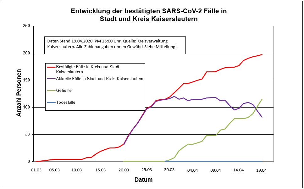 Heute kann das Gesundheitsamt der Kreisverwaltung Kaiserslautern eine sehr erfreuliche Meldung machen: 115 Personen gelten mittlerweile als geheilt ! – die Indexzahl der positiven Fälle liegt dagegen momentan bei lediglich 82 positiv auf das Coronavirus Getesteten!