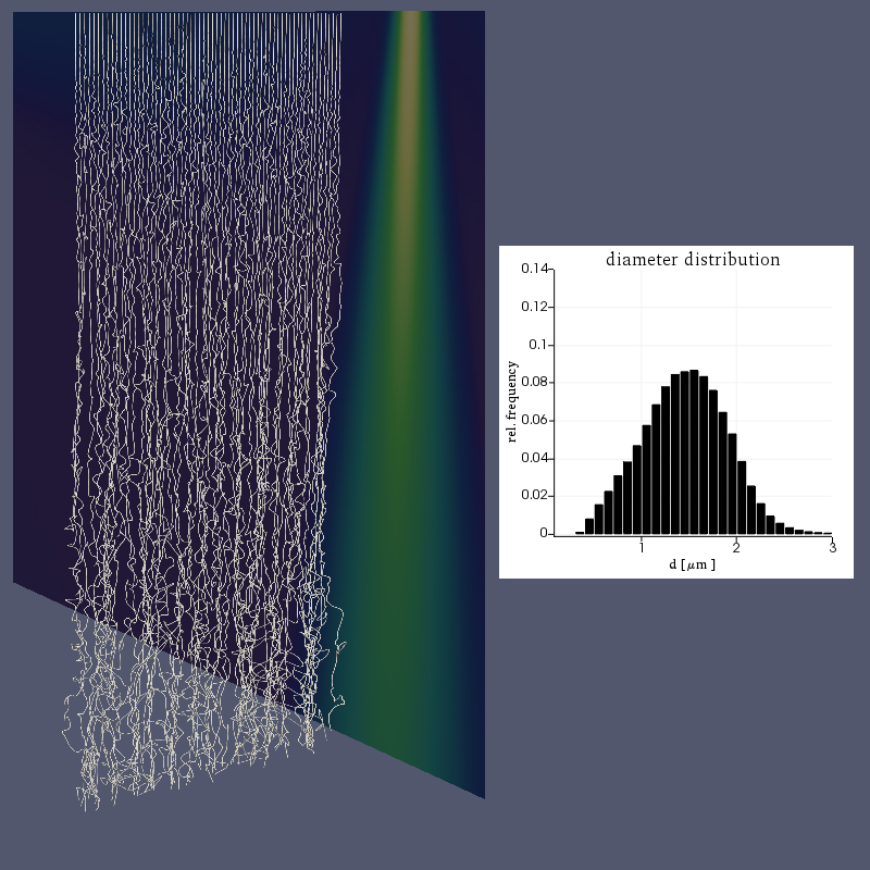 Die Methodik ist gut übertragbar auf Meltblown-Prozesse. Bei diesen liegt eine der Besonderheiten auf der Simulation der Filamentverstreckung im turbulenten Luftstrom – wie die Verstreckung verläuft, die Dynamik der Filamente und die Durchmesserverteilung. Das sind alles komplexe Aspekte, die mit einbezogen werden müssen, aber auch das Strömungsfeld oder die Temperaturverteilung. Die Simulationen der Forschenden am Fraunhofer ITWM ermöglichen dann einen qualitativen und quantitativen Einblick in die Faserentstehung in solchen Meltblown-Prozessen – weltweit einzigartig in dieser Form, wenn es um die Abbildung eines turbulenten Spinnprozesses (Meltblown) geht.