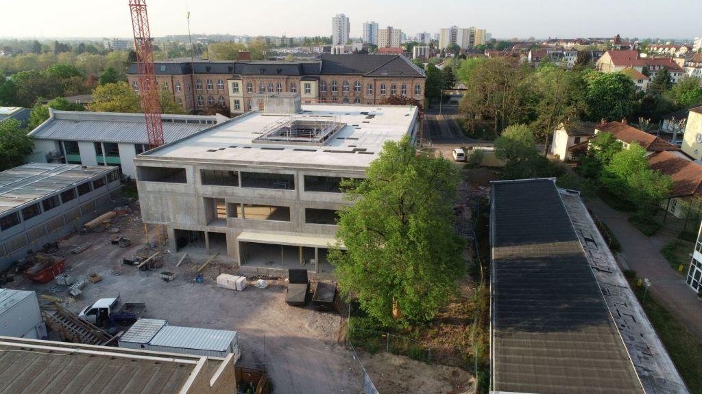 Ein Dreivierteljahr nach dem Beginn der Bauarbeiten und eineinhalb Jahre nach dem ersten Spatenstich steht der Schulneubau-Rohbau des Pfalzinstituts für Hören und Kommunikation (PIH) und des Karolinen-Gymnasiums (KG) in Frankenthal. Damit laufen die Bauarbeiten nach dem Zeitplan. Wären nicht die Gefahren der Corona-Pandemie, würden der Bezirksverband Pfalz und die Stadt Frankenthal nun ein Richtfest feiern. Wenn weiterhin alles gut läuft, soll das Schulgebäude im kommenden Jahr seiner Funktion übergeben werden.