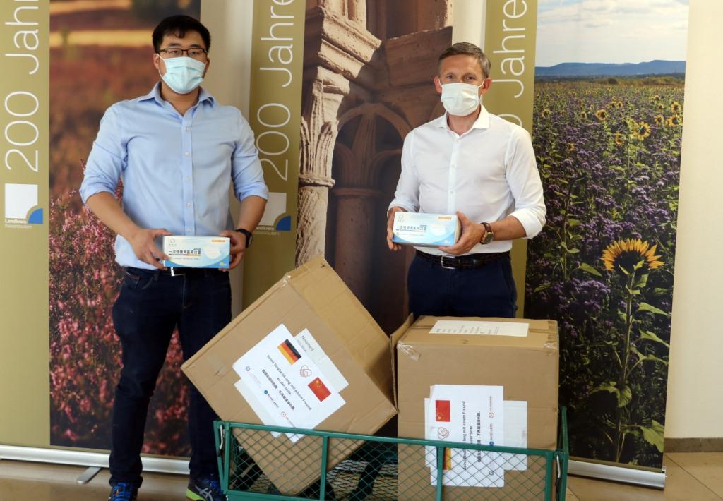 Seit 2019 hat die Wirtschaftsförderung von Stadt und Landkreis Kaiserslautern eine Repräsentanz in der chinesischen Metropole Foshan. Als Zeichen der Freundschaft und der Solidarität haben die chinesischen Partner nun insgesamt 10.000 OP-Masken als Geschenk an Stadt und Kreis geschickt. Landrat Ralf Leßmeister konnte heute davon 5000 OP-Masken für den Landkreis in Empfang nehmen, die WFK-Mitarbeiter Nico Au persönlich in die Kreisverwaltung brachte. „Das ist eine sehr schöne Geste und ein besonderes Zeichen der Freundschaft in Zeiten der Corona-Pandemie“, freut sich Landrat Ralf Leßmeister über die Spende aus Foshan. „Die OP-Masken werden an unseren verschiedenen Standorten für die Besucher unserer Verwaltung zur Verfügung gestellt.“