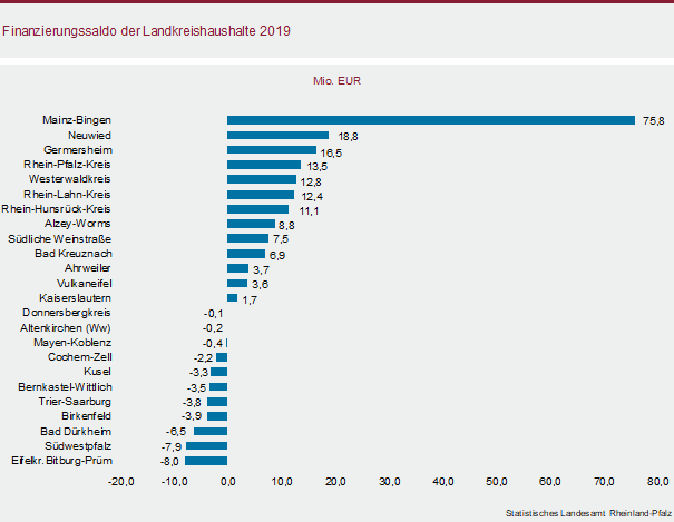 Von den Landkreisen schlossen insgesamt 13 das Jahr 2019 mit einem positiven, elf mit einem negativen Finanzierungssaldo ab. Der Kreis Mainz-Bingen kam mit deutlichem Abstand sowohl absolut als auch auf die Bevölkerung bezogen auf den höchsten positiven Finanzierungssaldo (75,8 Millionen Euro bzw. 359 Euro je Einwohnerin bzw. Einwohner). Die größten Defizite wurden in absoluten Werten für den Eifelkreis Bitburg-Prüm (minus 8 Millionen Euro) sowie einwohnerbezogen für die Südwestpfalz (minus 83 Euro je Einwohnerin bzw. Einwohner) dokumentiert.