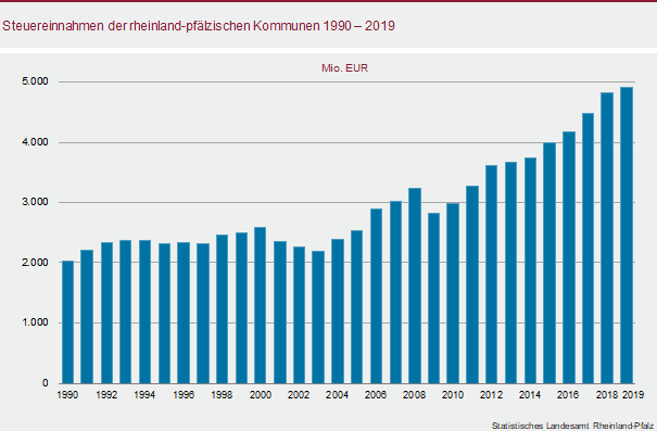 Im Jahr 2019 stiegen die kassenmäßigen Steuereinnahmen der Kommunen in Rheinland-Pfalz auf 4,91 Milliarden Euro. Das waren 1,5 Prozent bzw. 71 Millionen Euro mehr als im Jahr 2018. Wie das Statistische Landesamt in Bad Ems anhand von vorläufigen Zahlen mitteilt, stiegen die kommunalen Einnahmen damit im zehnten Jahr in Folge. Sie waren rund 74 Prozent höher als 2009.