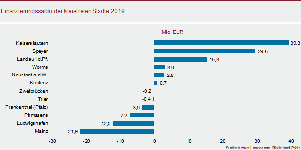 Der Finanzierungssaldo fällt in den Gebietskörperschaften unterschiedlich aus. Die Hälfte der kreisfreien Städte kam auf einen positiven, die andere Hälfte auf einen negativen Saldo. Für Kaiserslautern (39,3 Mio. Euro) wurde der höchste positive, für die Landeshauptstadt Mainz (minus 21,9 Millionen Euro) der höchste negative Saldo ermittelt. Bezogen auf die Bevölkerung erzielte Speyer den höchsten positiven Finanzierungssaldo (584 Euro je Einwohnerin bzw. Einwohner). Am anderen Ende der Skala lag Pirmasens mit einem einwohnerbezogenen Fehlbetrag von 179 Euro.