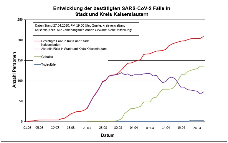 Am 27. April hat das Labor keinen neuen Fall gemeldet, die Zahl Geheilten hat sich um 4 weitere Personen erhöht. Davon leben 3 in der Stadt Kaiserslautern und 1 Person im Kreis .