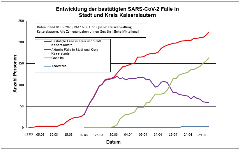 Die Zahl der Indexfälle in Stadt und Landkreis Kaiserslautern liegt bei 223. Aufgrund landeseinheitlicher RKI-Vorgaben werden die 163 geheilten Personen und die mittlerweile 4 Todesfälle jedoch weiter in der Gesamtstatistik der positiven Fälle weiter mitgeführt.