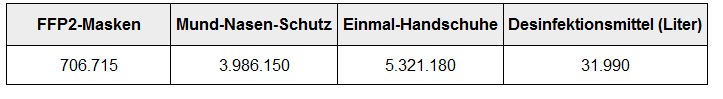Insgesamt wurden durch das für die Beschaffung und Verteilung von Persönlicher Schutzausrüstung und Desinfektionsmittel verantwortliche Landesamt für Soziales, Jugend und Versorgung seit dem 18. März folgende Ressourcen verteilt: