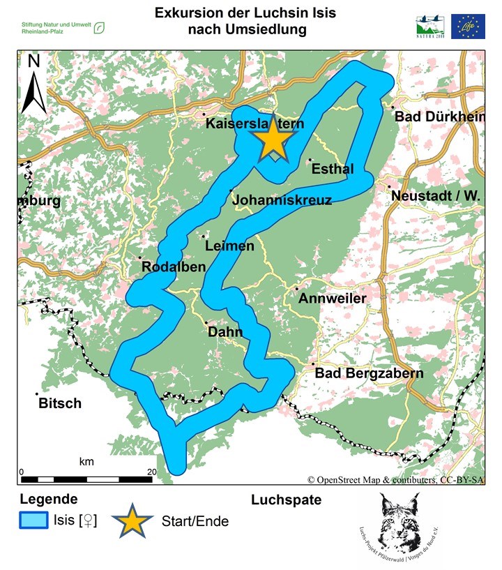 Die drei Schweizer Luchsweibchen, die dieses Frühjahr in den Pfälzerwald umgesiedelt wurden, erkunden großräumig ihre neue Heimat. Die Mitte Februar freigelassene Luchsin Isis, Patentier des Vereins Luchs-Projekt Pfälzerwald / Vosges du Nord, startete nach knapp einem Monat eine große Erkundungstour durch den Pfälzerwald in die Nordvogesen und zurück. Ihr Rundweg führte sie dabei von Waldleiningen in Richtung Süden, vorbei an Pirmasens, bis in die Gegend des französischen Langensoultzbach und zurück an Neustadt/Weinstr. vorbei bis hoch nach Carlsberg. Aktuell hält sie sich wieder südlich von Kaiserslautern auf.